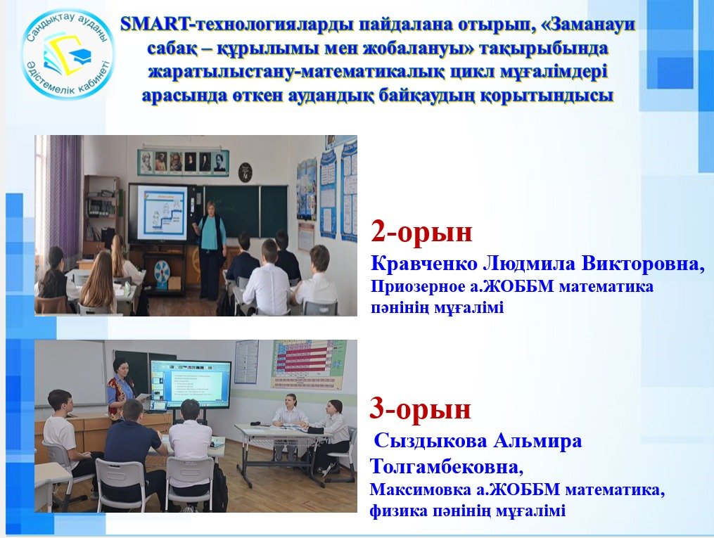 SMART-технологияларды пайдалана отырып, «Заманауи сабақ – құрылымы мен жобалануы» тақырыбында жаратылыстану-математикалық цикл мұғалімдері арасында өткен аудандық байқаудың қорытындысы