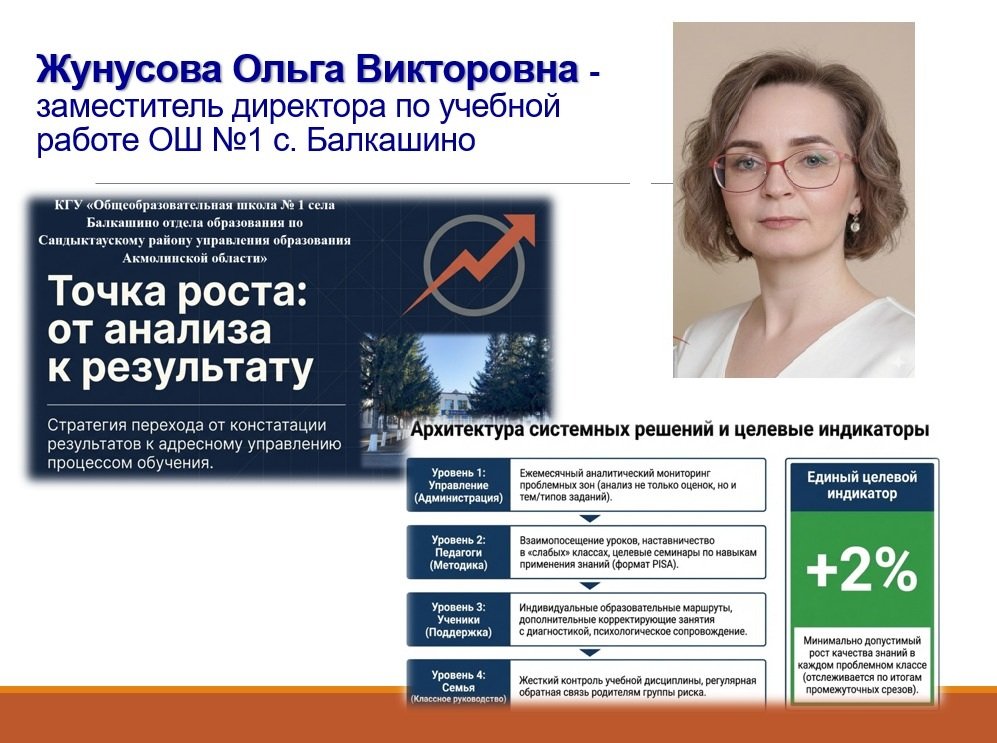Конкурс проходил в два этапа. Участниками были представлены мини-проекты повышения качества образования в школе. По итогам областного конкурса заместитель директора по учебной работе общеобразовательной школы № 1 села Балкашино – Жунусова Ольга Викторовна заняла 2...