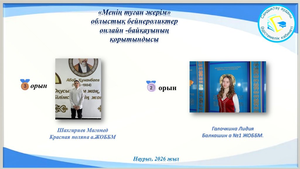 «Менің туған жерім» атты облыстық бейнероликтер онлайн-байкауы өтті. Байқау қорытындысы бойынша: 2 орын: Галочкина Лидия - Балкашин ауылының №1 ЖОББМ; 3 орын: Шахгириев Магомед- Красная Поляна ауылының ЖОББМ. Жүлдегерлерді...