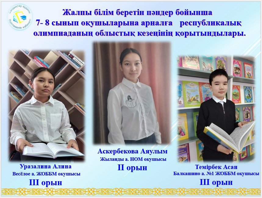 Ағымдағы жылдың 5–7 ақпан аралығында Көкшетау қаласында жалпы білім беретін пәндер бойынша 7-8 сынып оқушыларына арналған республикалық олимпиаданың облыстық кезеңі өтті. Біздің ауданнан Балкашино ауылының №1 ЖОББМ, Балкашино ауылының №2 ЖОББМ, Весёлое ауылының ЖОББМ, Жыланды ауылының НО мектептерінен бес оқушы қатысты. Қорытындысында оқушыларымыз үш жүлделі орынға ие болды. «Қазақ тілінде оқытатын мектептердегі орыс тілі» пәні бойынша Жыланды ауылының негізгі орта мектебінің оқушысы Аскербекова Аяулым ІІ орын иеленді (пән мұғалімі – Жирентаева Амина Даирбековна). «Ағылшын тілі» пәні бойынша Балкашино ауылының №1 жалпы орта білім беретін мектебінің оқушысы Темірбек Асан ІІІ орын иеленді (пән мұғалімі – Жуманова Дина Елубаевна); «Орыс тілі мен әдебиеті» пәні бойынша Весёлое ауылының жалпы орта білім беретін мектебінің оқушысы Уразалина Алина ІІІ орын иеленді (пән мұғалімі – Қасымова Марина Ситжановна). Оқушыларымызды және олардың жетекшілерін жақсы нәтижемен құттықтаймыз! Барлық қатысушыларға алдағы уақытта жаңа жеңістер мен толағай табыстар тілейміз!